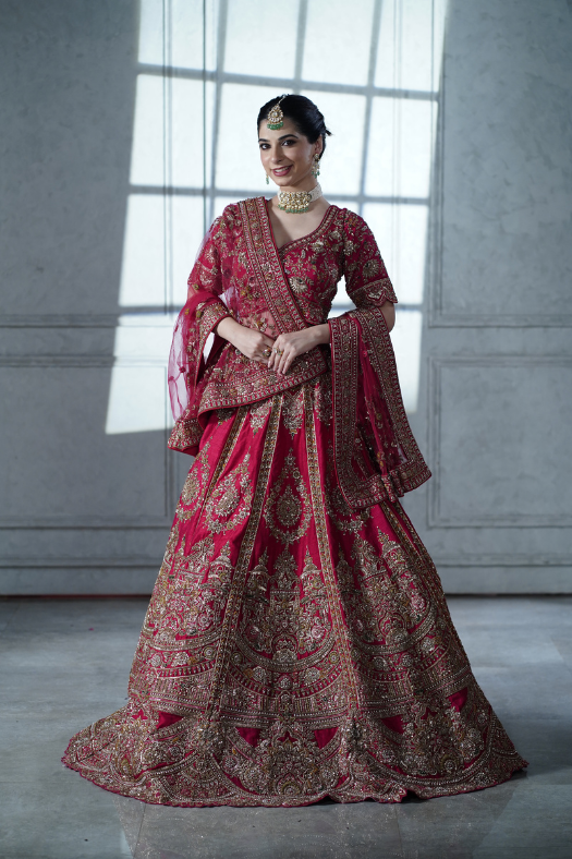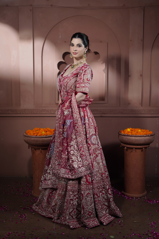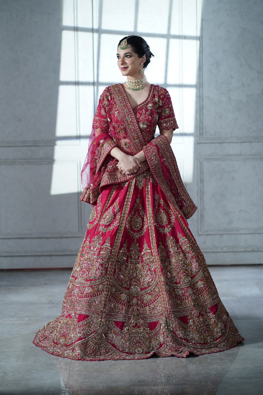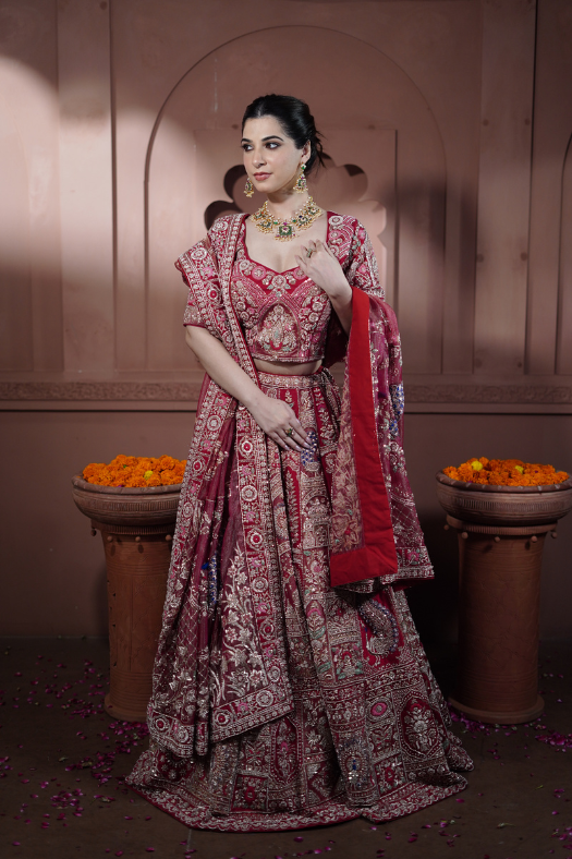 Key Features Grand Tapestry: Features dense, traditional Zardosi and Pitta work depicting intricate architectural and floral heritage patterns. Dual-Tone Accents: Ornate borders highlighted with gold and silver thread work for a multi-dimensional look. Sophisticated Cut: Half-sleeved blouse with a plunging sweetheart neckline and a heavy-flare bridal skirt. Plush Finish: Complemented by a velvet-bordered dupatta for a luxurious, royal feel.